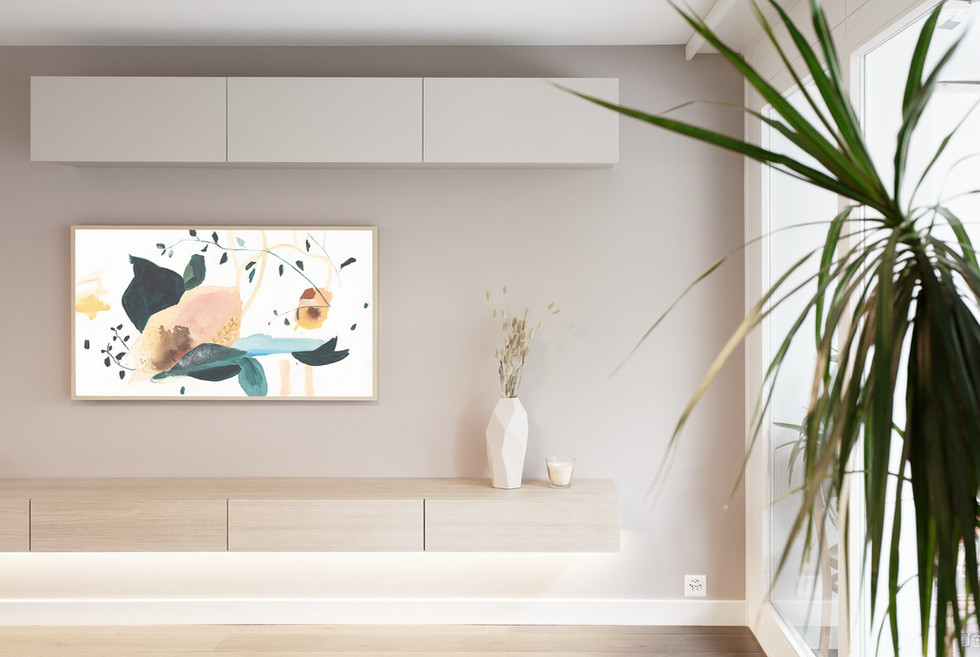 An office area has been created in the living room, extended by the carpentry which emphasizes the length and visually expands the space.