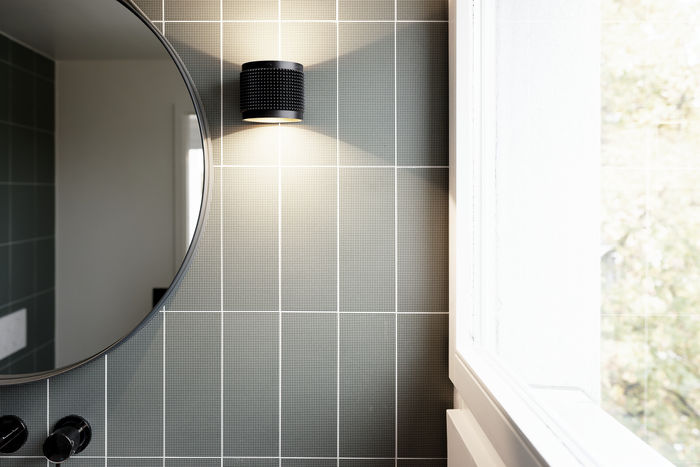 In the en-suite shower room, a large shower has been created and the allure of room has been modernized by these graphic tiles, inspired by graph paper.