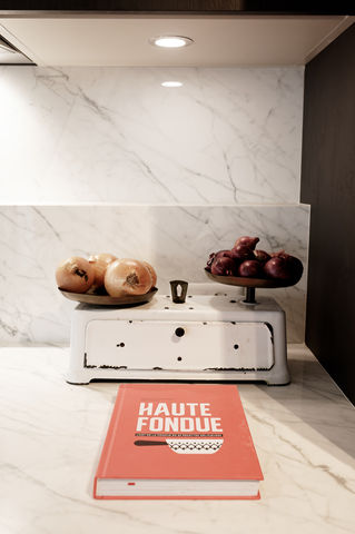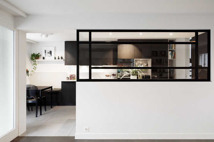 The customs-designed glass partition marks the separation between the living-room and the kitchen.