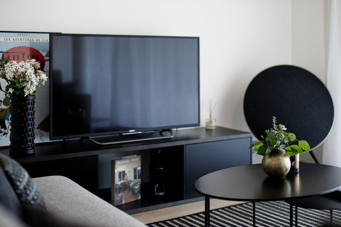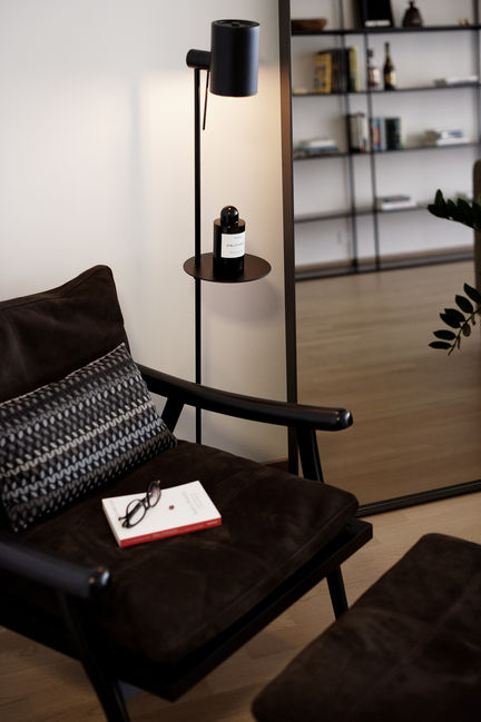 We chose to install dark materials or the main furniture pieces, as we wanted to have a visual contrast with the existing natural oak parquet.